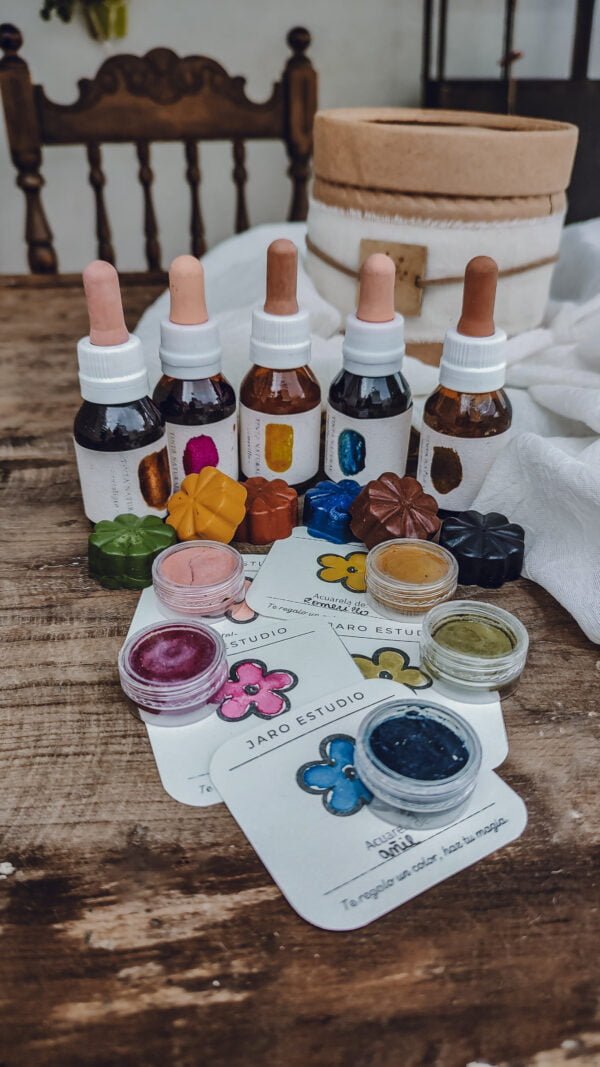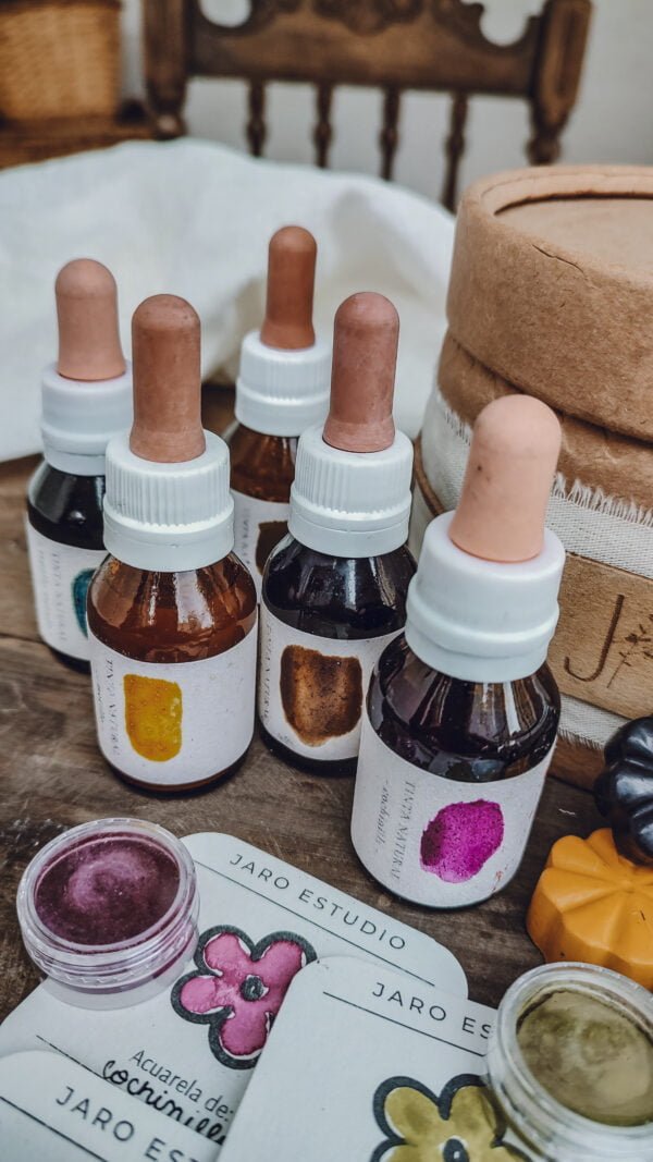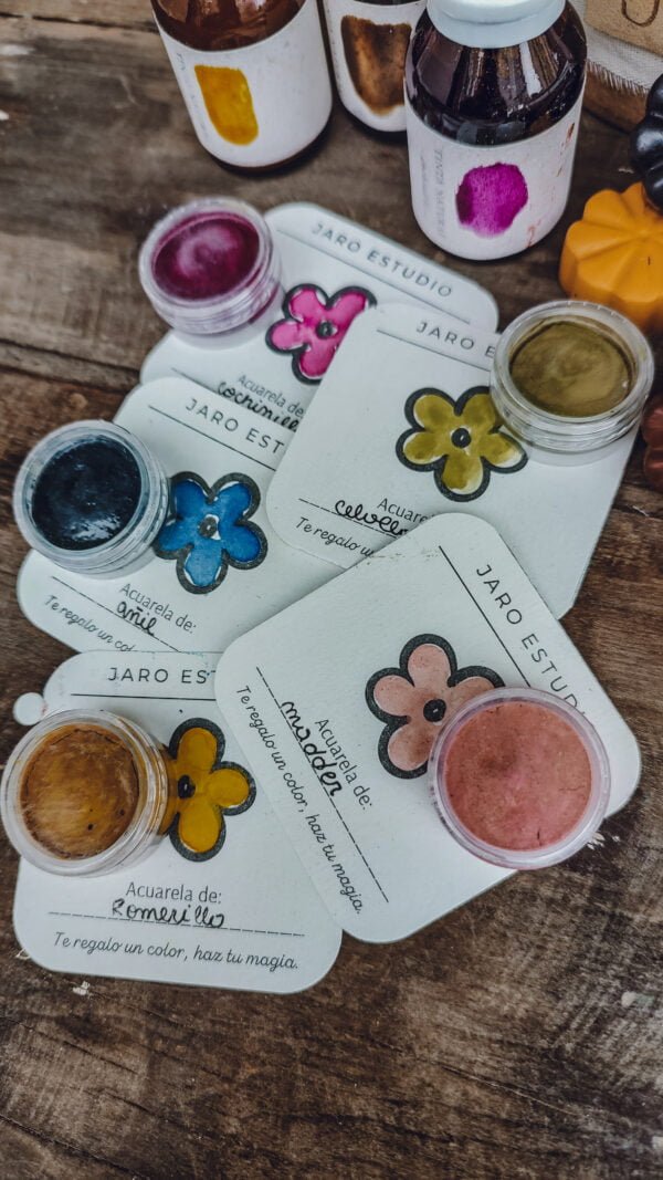 – 5 acuarelas fabricadas con pigmentos vegetales. Colores según disponibilidad (siempre un espectro completo y versátil para mezclar)