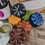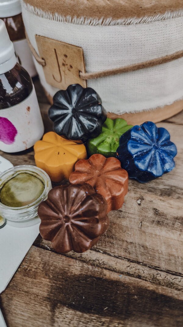 – 6 Crayones artesanales fabricados con ceras vegetales y pigmentos de óxidos de hierro. Tamaño bombón. Los colores expuestos en la foto.