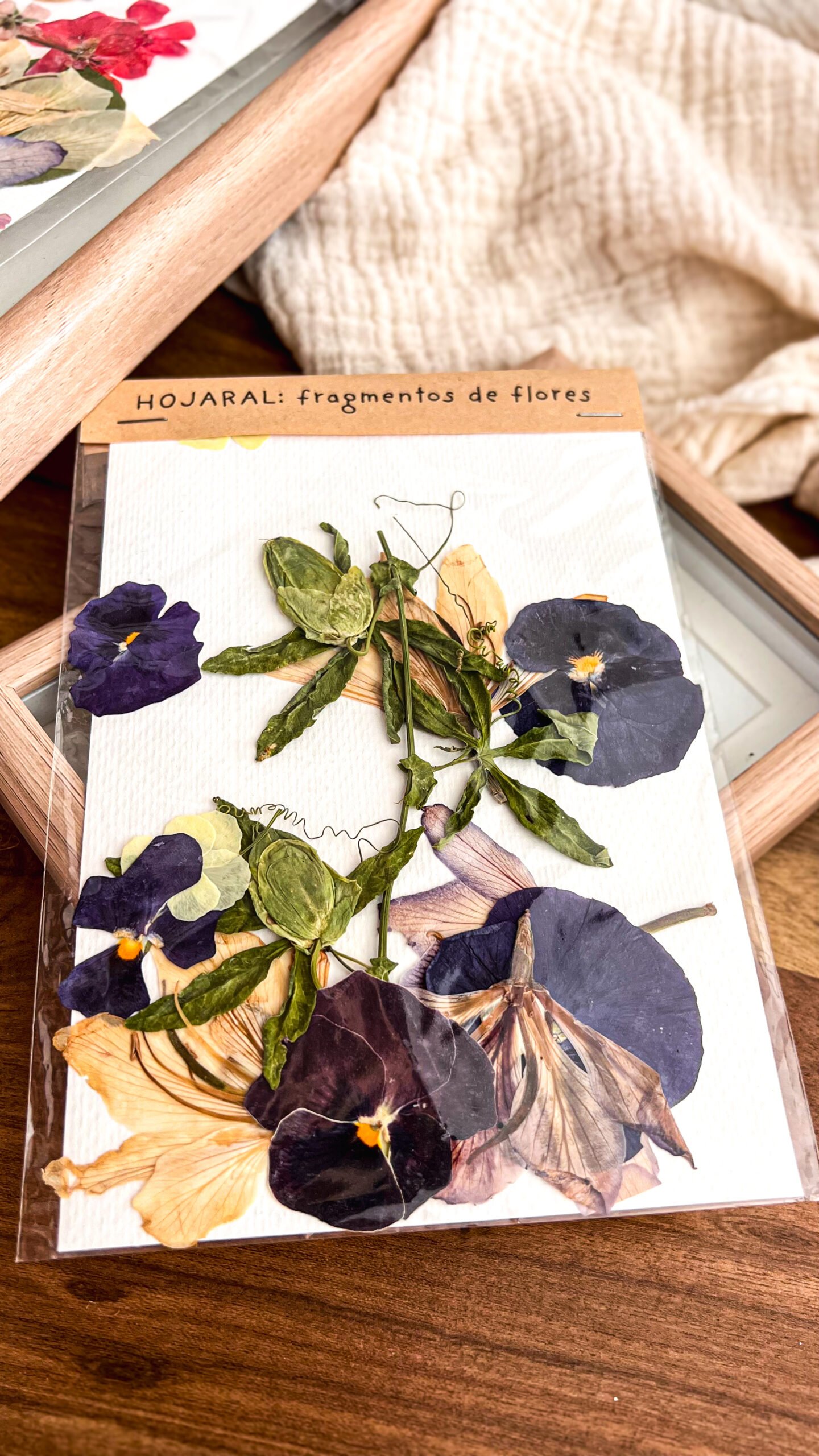 Este set reúne 16 flores prensadas, un marco de madera de 12×17 cm. palabras afines que acompañan la composición y pegamento sin ácido, pensado especialmente para collage floral.