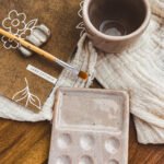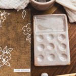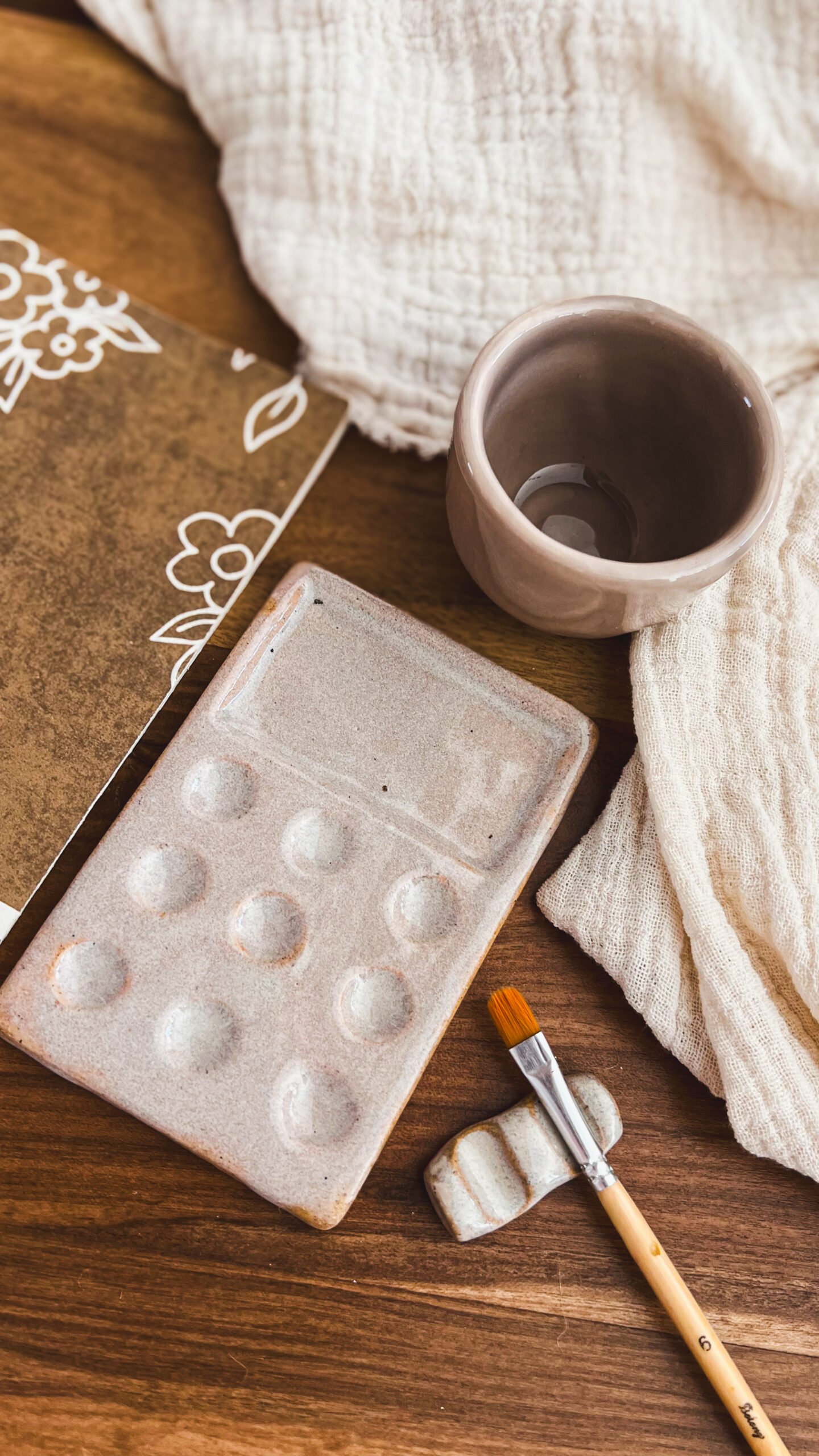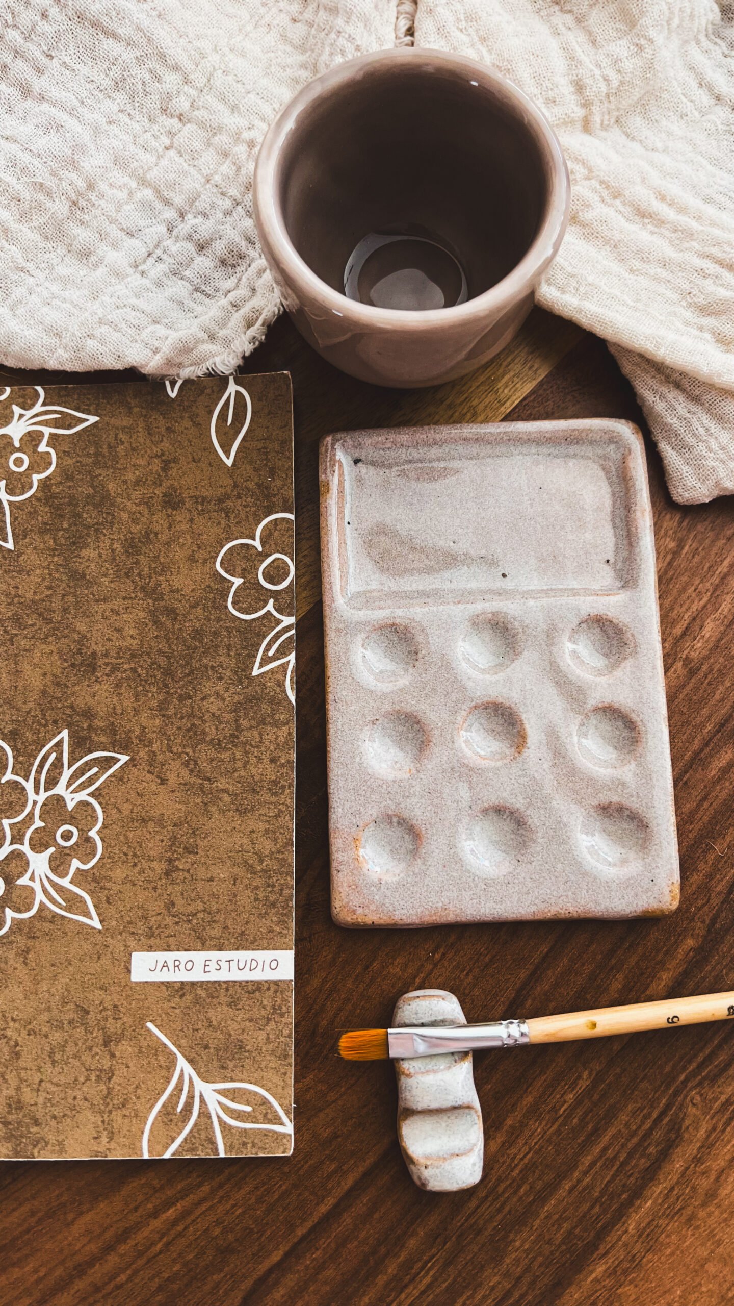 Incluye piezas de cerámica de gres, hechas de manera artesanal: paleta, vaso y apoya pincel. Superficies nobles, resistentes, pensadas para el uso cotidiano y el trabajo con agua.